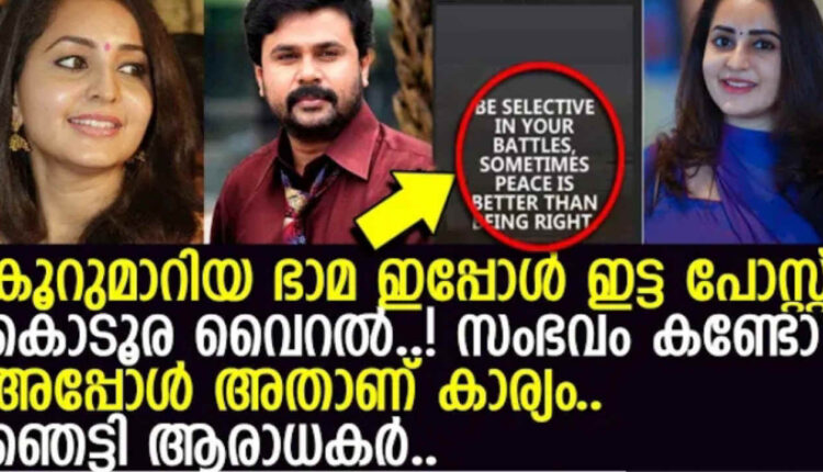 യുദ്ധങ്ങൾ സൂക്ഷിച്ചു മാത്രം തിരഞ്ഞെടുക്കുക. ചിലപ്പോഴൊക്കെ ശരി ചെയ്യുന്നതിനേക്കാൾ മികച്ചത് സമാധാനം ആണെന്ന് ആയിരുന്നു താരം ഇൻസ്റ്റാഗ്രാം സ്റ്റാറ്റസ് ആയി കുറിച്ചത്. ശുഭാപ്തി വിശ്വാസത്തോടെ ഇരിക്കുക എന്നും ഭാമയുടെ സ്റ്റാറ്റസിൽ ഉണ്ട്.