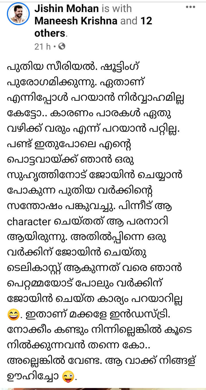 അതിൽപ്പിന്നെ ഒരു വർക്കിന് ജോയിൻ ചെയ്തു ടെലികാസ്റ്റ് ആകുന്നത് വരെ ഞാൻ പെറ്റമ്മയോട് പോലും വർക്കിന് ജോയിൻ ചെയ്ത കാര്യം പറയാറില്ല. ഇതാണ് മക്കളേ ഇൻഡസ്ട്രി. നോക്കീം കണ്ടും നിന്നില്ലെങ്കിൽ കൂടെ നിൽക്കുന്നവൻ തന്നെ കോ.. അല്ലെങ്കിൽ വേണ്ട. ആ വാക്ക് നിങ്ങള് ഊഹിച്ചോ എന്ന് ജിഷിൻ മോഹൻ സഹതാരത്തിനൊപ്പമുളള ചിത്രം പങ്കുവെച്ചുകൊണ്ട് കുറിച്ചു.