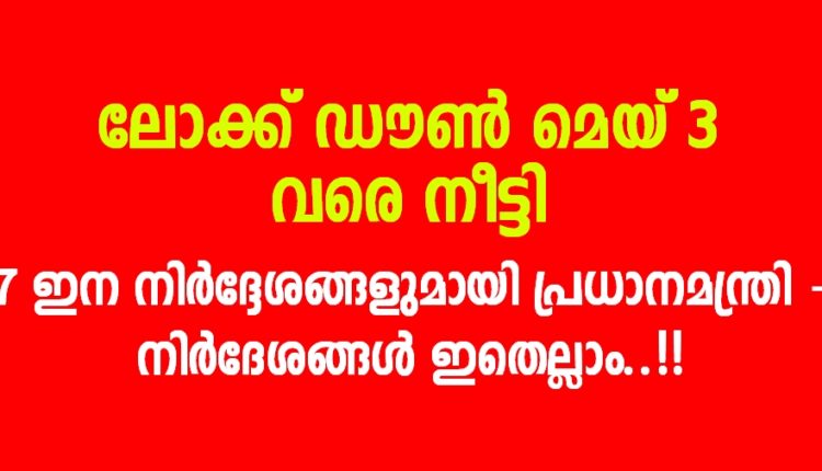 രാജ്യത്ത് കൊറോണ ഭീതിയിൽ ലോക രാഷ്ട്രങ്ങളെ തട്ടിച്ചു നോക്കുമ്പോൾ കുറഞ്ഞു എങ്കിൽ കൂടിയും ലോക്ക് ഡൗൺ 19 ദിവസം കൂടി നീട്ടിയിരിക്കുകയാണ് പ്രധാനമന്ത്രി നരേന്ദ്ര മോഡി. പുതിയ ലോക്ക് ഡൌൺ നിർദേശങ്ങൾ നാളെ പ്രഖ്യാപിക്കും എന്നും അദ്ദേഹം 25 മിനിറ്റ് നീണ്ടു നിന്ന പ്രസംഗത്തിൽ പറഞ്ഞു.
