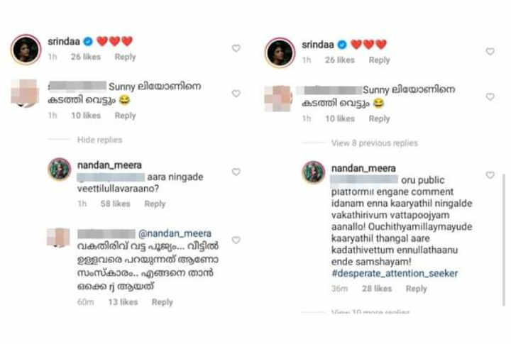 ചിത്രം സോഷ്യൽ മീഡിയ വളരെ പെട്ടെന്നു തന്നെ ഏറ്റെടുത്തു. ചിത്രത്തിന് കമന്റുകളുമായി താരങ്ങളുമെത്തി. ഇതിനിടെ ചില സദാചാരവാദികളും തലയുയർത്തുന്നുണ്ട്. ഇത്തരത്തിലുള്ള ഒരു കമന്റിന് മീര നൽകിയ മറുപടി ഇപ്പോൾ ശ്രദ്ധ നേടുകയാണ്. സണ്ണി ലിയോണിനെ കടത്തിവെട്ടും എന്നായിരുന്നു ചിത്രത്തിന് ഒരാൾ നൽകിയ കമന്റ്. ഇതിന് മറുപടിയുമായി മീരയുമെത്തി. ആരാ നിങ്ങടെ വീട്ടിലുള്ളവരാണോ എന്നായിരുന്നു മീരയുടെ മറുപടി.