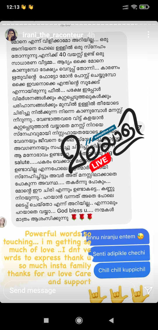 പകരം വെക്കാൻ ഇനി ഒരാൾ ഉണ്ടാവില്ല എന്നപോലെ ആത്മാർഥമായി സ്നേഹിച്ചിട്ടും അവർ അത് മനസിലാക്കാതെ പോകുന്ന അവസ്ഥ തകർന്നു പോകും.. മോനെ നിന്റെ ചിരി എന്നും ഉണ്ടാകട്ടെ കണ്ണുകൾ നിറയുന്നു.. പറയാൻ വന്നത് അതുപോലെ ടൈപ്പ് ചെയ്‌തോ എന്നിറിയില്ല. എന്നാലും പറയാതെ വയ്യ.. ഇങ്ങനെ ആയിരുന്നു കുറിപ്പ്. എന്റെയും കണ്ണുകൾ നിറയുന്നു എന്നായിരുന്നു ജിയ മറുപടി ആയി കുറിച്ചത്.