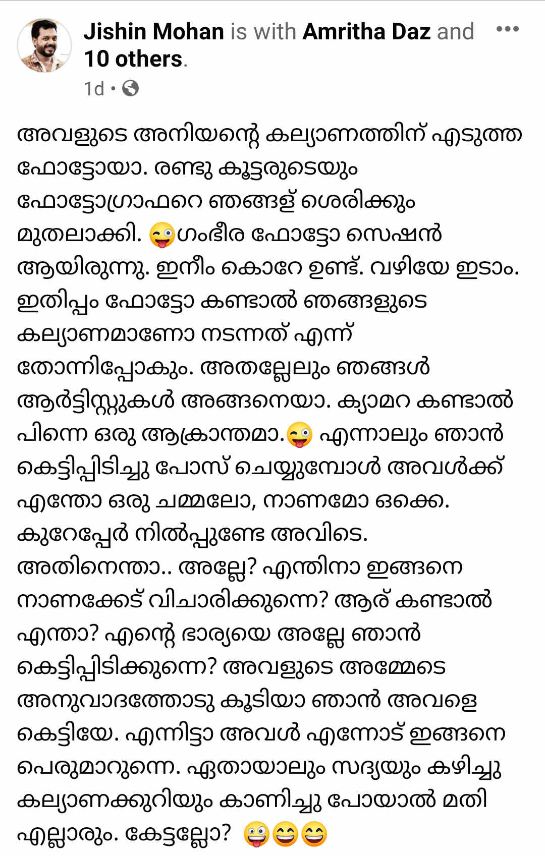 അവളുടെ അമ്മേടെ അനുവാദത്തോടെ കൂടെയാണ് ഞാൻ കെട്ടിയത്; കെട്ടിപിടിക്കുന്നത് എന്റെ ഭാര്യയെ; സീരിയൽ താരം ജിഷിന്റെ കുറിപ്പ്..!!